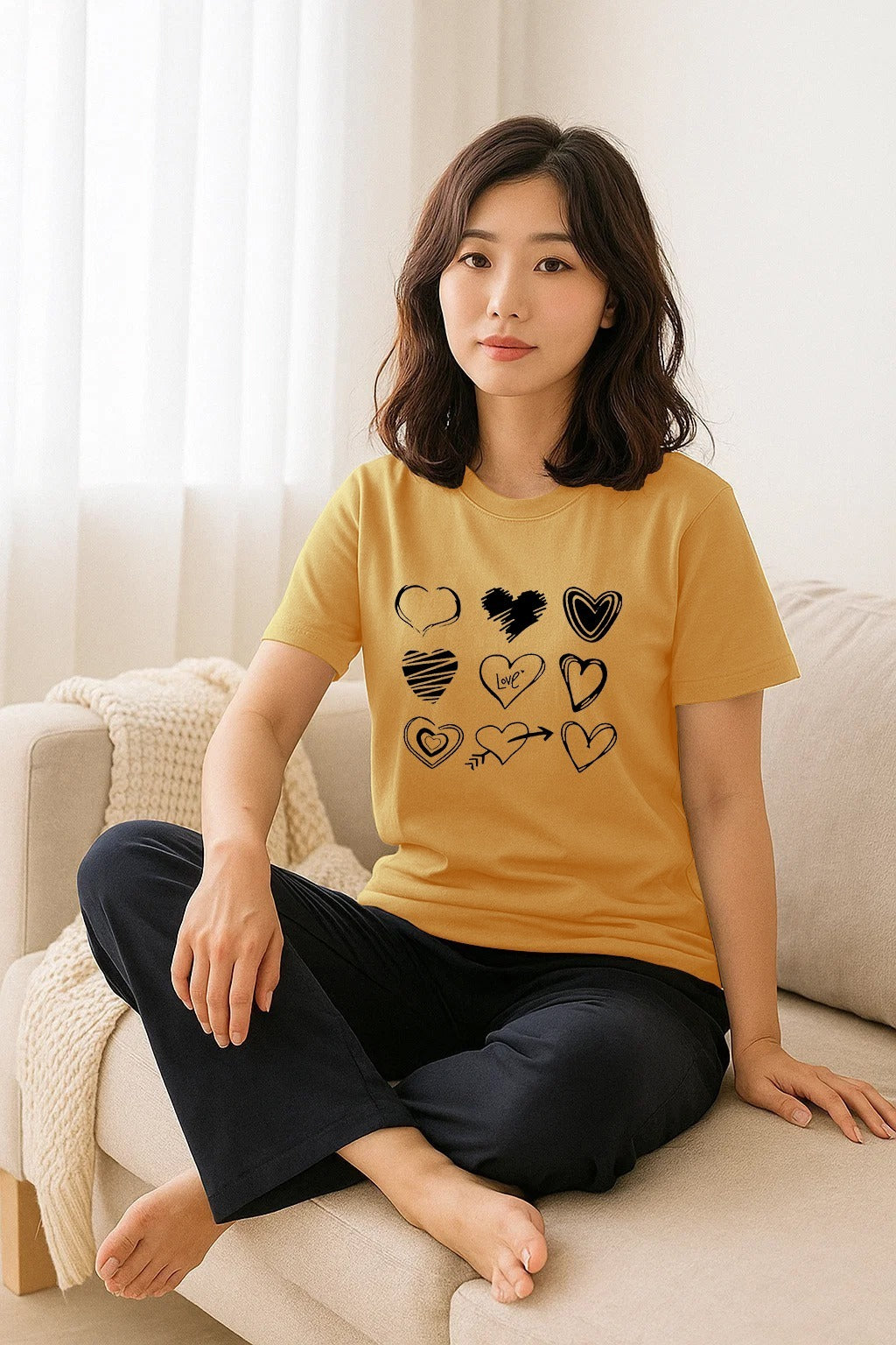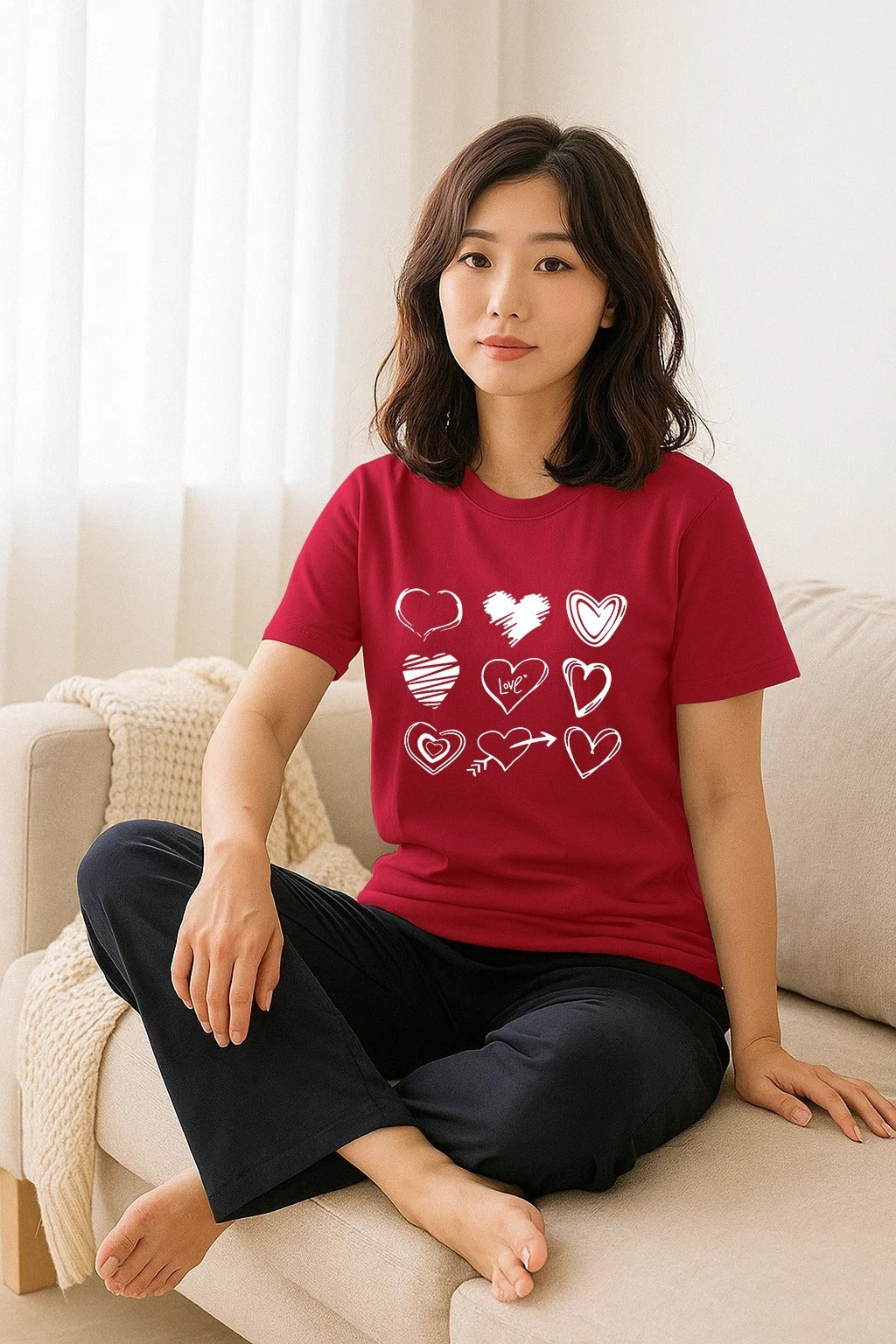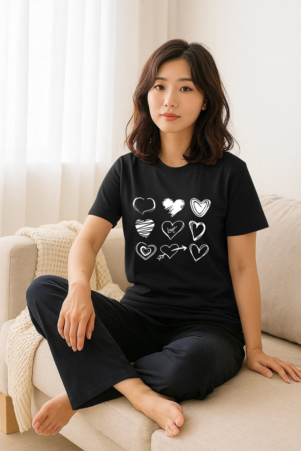 Black T-Shirt with Hand-Drawn Sketch Heart Grid Graphic - Casual & Trendy Tee