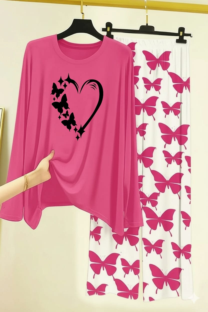 PINK Women sycal Printed Nightwear Set with Butterfly Printed Trousers – Women's Lounge Wear