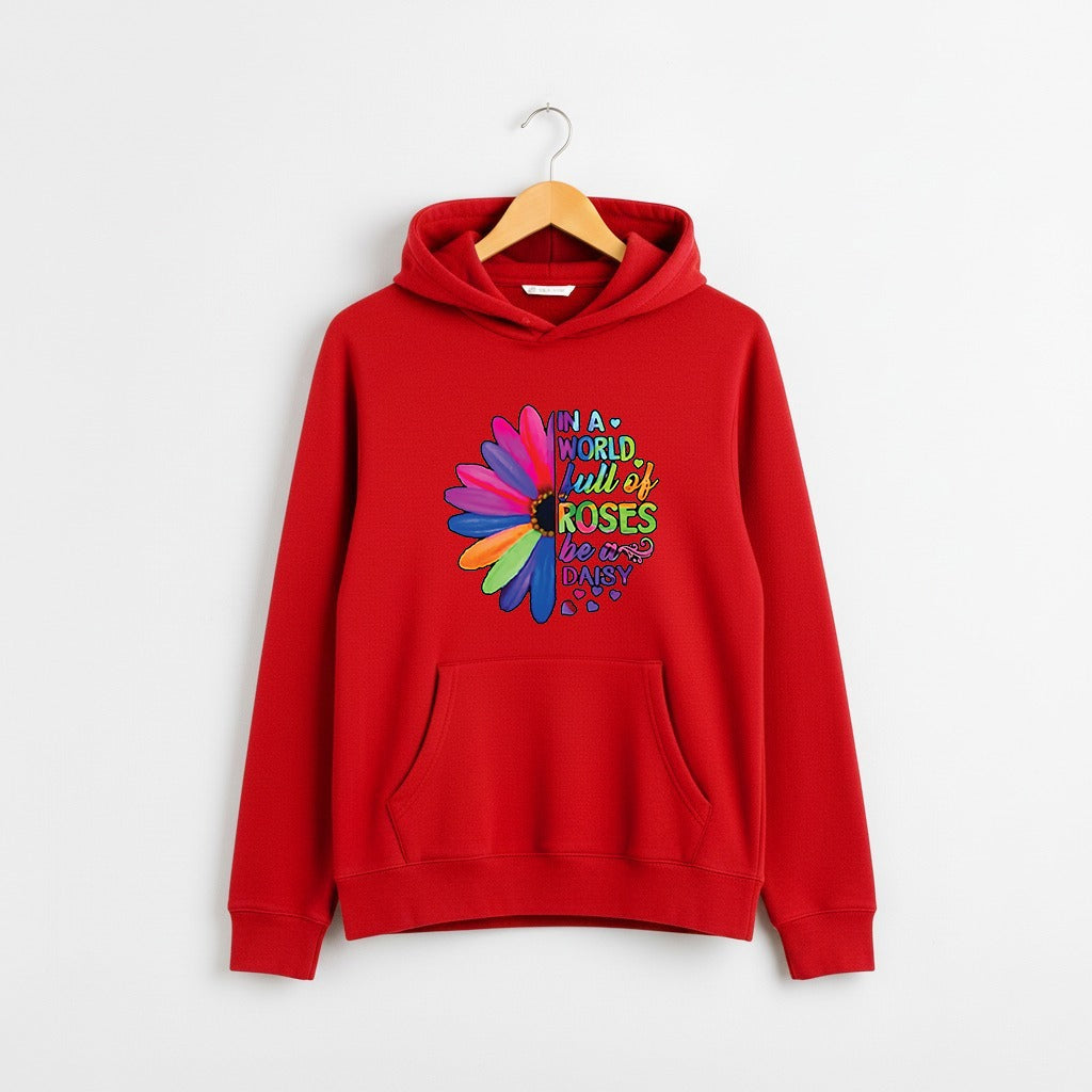 A motivational and brightly colored red hoodie. The centerpiece is a large flower with a black center and petals in every color of the rainbow. Overlaying the flower and extending to the side is the uplifting text quote: "IN A WORLD FULL OF ROSES BE A DAISY," encouraging individuality and standing out.